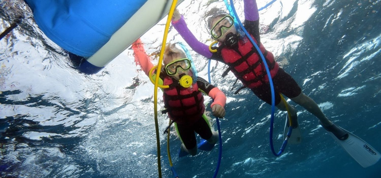 SNUBA® is a shallow water diving system whereby customers can explore underwater up to 3 metres. No need to wear heavy equipment, the air tanks float on the surface and you breathe through a normal scuba regulator mouthpiece.